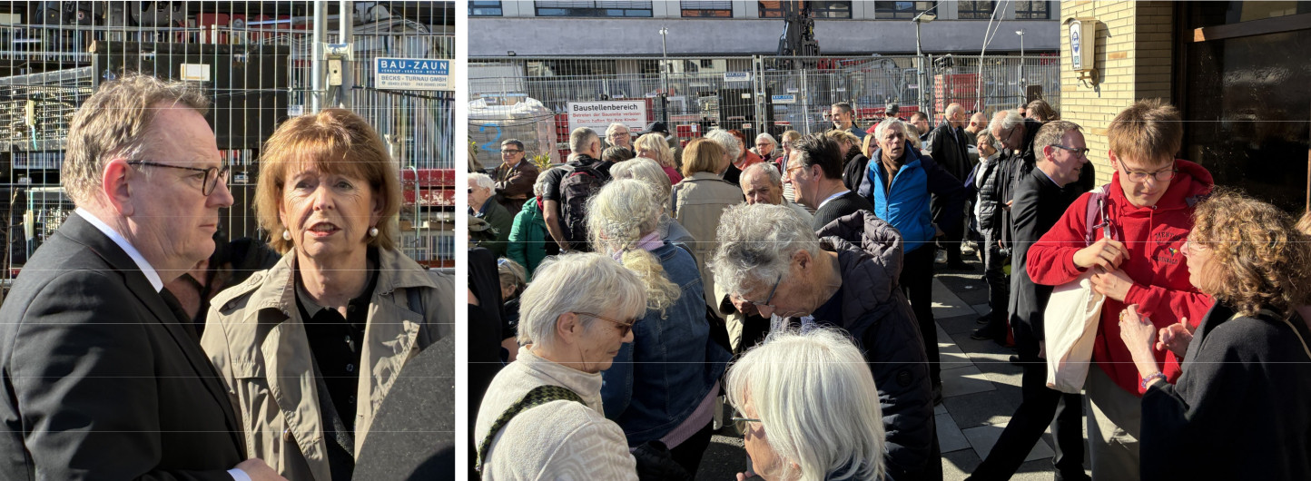 Er sei persönlich immer wieder „sehr bewegt“, wenn der an den Einsturz des Historischen Archivs der Stadt Köln denke, sagte Oberbürgermeister Torsten Burmester. „Auch nach 17 Jahren fühlt es sich an, als sei es gestern gewesen. Ich habe damals in der Südstadt gelebt und spüre noch heute den Schock und den Schmerz.“ Burmester, der zum ersten Mal auf der Gedenkveranstaltung am Einsturzort sprach, plädierte dafür, die Erinnerung wach zu halten. Zugleich lobte er den Einsatz der Initiativen, die sich nach dem Einsturz gebildet haben: „Köln hat erlebt, wie wichtig kritisches Bürger-Engagement ist. Das ist kein Störfaktor, das ist ein Schatz,“ betonte Burmester vor der Kneipe „Papa Rudi’s“. Er verwies auf den Ratsbeschluss vom Sommer 2025, der auf Betreiben der Initiativen zustande gekommen ist. „Wir haben gemeinsam mit der Projektwerkstatt Ideen für den Waidmarkt entwickelt." Die Künstler-Interventionen – als erstes war Observatorium vor Ort, drei weitere werden in Jahresabstand folgen – "geben uns eine Chance, den Ort neu wahrzunehmen.“ Der Oberbürgermeister nutzte den Tag, um viele Gespräche mit Betroffenen und Engagierten am Ort zu führen. Um 13.58 Uhr, zur Zeit des Einsturzes im Jahr 2009, läuteten die Glocken der Südstadt-Kirchen. Das Publikum verharrte in stillem Gedenken.