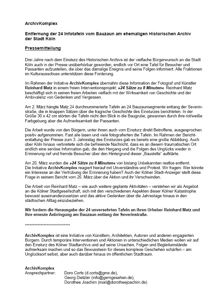 Enthüllung an der Einsturzstelle - Siebter Jahrestag des Archiveinsturzes